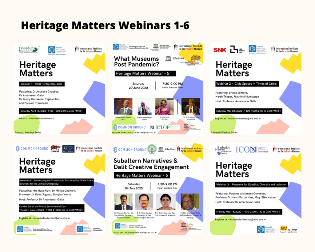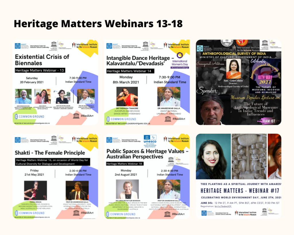 The triangulation – of the Pandemic for which no country or community was prepared; the cultural dimension of climate crisis long ignored due to the colonial hegemonic binary discourse of nature and culture; and Black Lives Matter movement that exposed global continuation of gross inequities – has brought the arts, culture, heritage and environmental sectors into a deep crisis. As we ride the wave or tsunami of emergencies, the challenge remains as to how we move forward building on the resilience of communities and cultural groups. What is the best way for governments to make interventions with immediate and long-term impacts? How best can civil society engage? What does inclusion and sustainability mean in the immediate and long-term futures? In order to safeguard the grassroots cultural and linguistic diversity what are the pathways for the future? What of the criticality of the decolonisation of heritage discourse? We know how much Heritage Matters, but how can we position heritage in all its manifestations in the holistic discourse of sustainable heritage development? How do we rethink the way we approach the UN Sustainable Development Goals? How do we continue to locate and advocate for culture in development through demonstration projects? These and many other questions and concerns are addressed in this series of Webinars facilitated by the International Institute for the Inclusive Museum; UNESCO Chair on Inclusive Museums and Sustainable Heritage Development and the International Centre for Inclusive Cultural Leadership, AnantU; and Common Ground Research Networks.