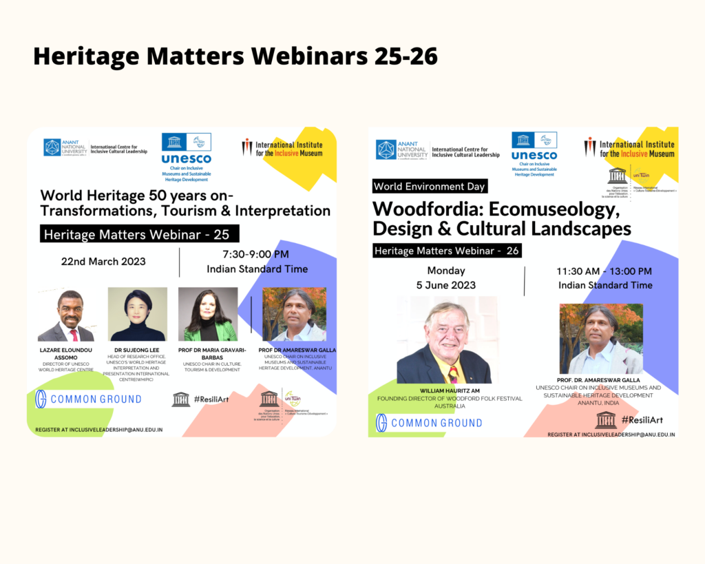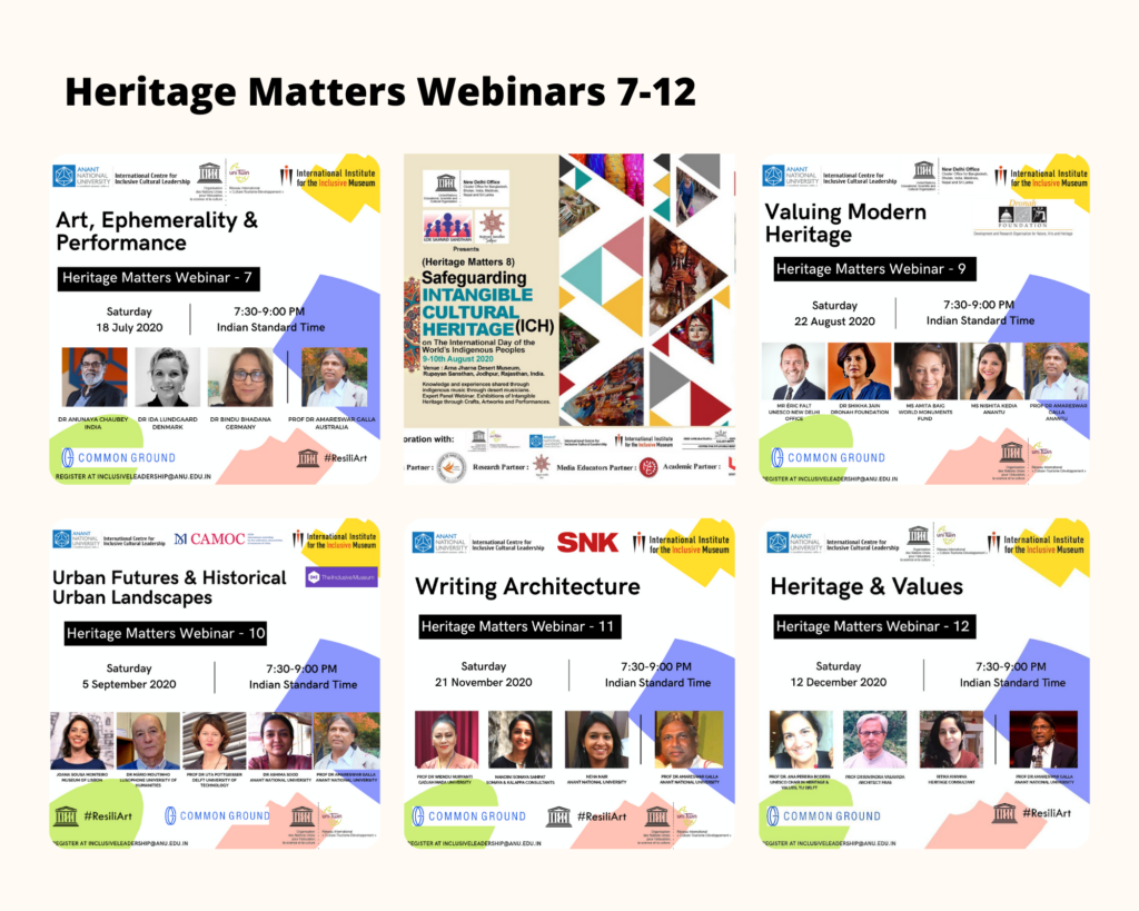 The triangulation – of the Pandemic for which no country or community was prepared; the cultural dimension of climate crisis long ignored due to the colonial hegemonic binary discourse of nature and culture; and Black Lives Matter movement that exposed global continuation of gross inequities – has brought the arts, culture, heritage and environmental sectors into a deep crisis. As we ride the wave or tsunami of emergencies, the challenge remains as to how we move forward building on the resilience of communities and cultural groups. What is the best way for governments to make interventions with immediate and long-term impacts? How best can civil society engage? What does inclusion and sustainability mean in the immediate and long-term futures? In order to safeguard the grassroots cultural and linguistic diversity what are the pathways for the future? What of the criticality of the decolonisation of heritage discourse? We know how much Heritage Matters, but how can we position heritage in all its manifestations in the holistic discourse of sustainable heritage development? How do we rethink the way we approach the UN Sustainable Development Goals? How do we continue to locate and advocate for culture in development through demonstration projects? These and many other questions and concerns are addressed in this series of Webinars facilitated by the International Institute for the Inclusive Museum; UNESCO Chair on Inclusive Museums and Sustainable Heritage Development and the International Centre for Inclusive Cultural Leadership, AnantU; and Common Ground Research Networks.
