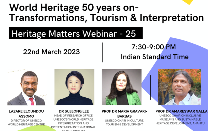 Title - World Heritage 50 Years on: Transformations, Tourism and Interpretation Date - Wednesday, 22nd March 2023 Time - 7:30-9:00 PM Indian Standard Time Recording Link - Click Here The past five decades have seen considerable progress in the ...